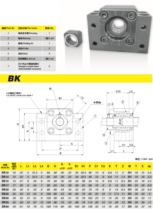 支撐座是在絲杠和螺母之間以滾珠為滾動體的螺旋傳動元件,固定側的支撐單元裝有經預壓調整的JIS5級的角接觸球軸承,支撐側的支撐單元使用深溝球軸承,它是一種精密、高效率、高剛度、高壽命且具有穩定的回轉性能的先進傳動元件,可將電動機的旋轉運動轉化為工作臺的直線運動,常見系列為BK、BF、EK、EF、FK、FF等。